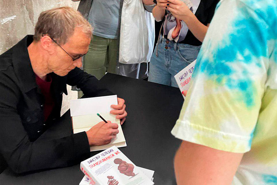 На кадрах человек, похожий на писателя, раздает поклонникам автографы в подвале, рядом с ним можно заметить новую книгу писателя — «TRANSHUMANISM INC.».
