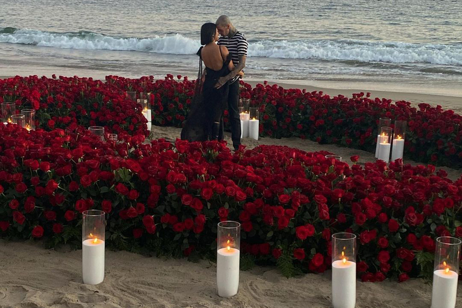 Баркер попросил Кардашьян выйти за него замуж 17 октября. Это произошло на закате в отеле Rosewood Miramar Beach, пара была окружена красными розами и белыми свечами.