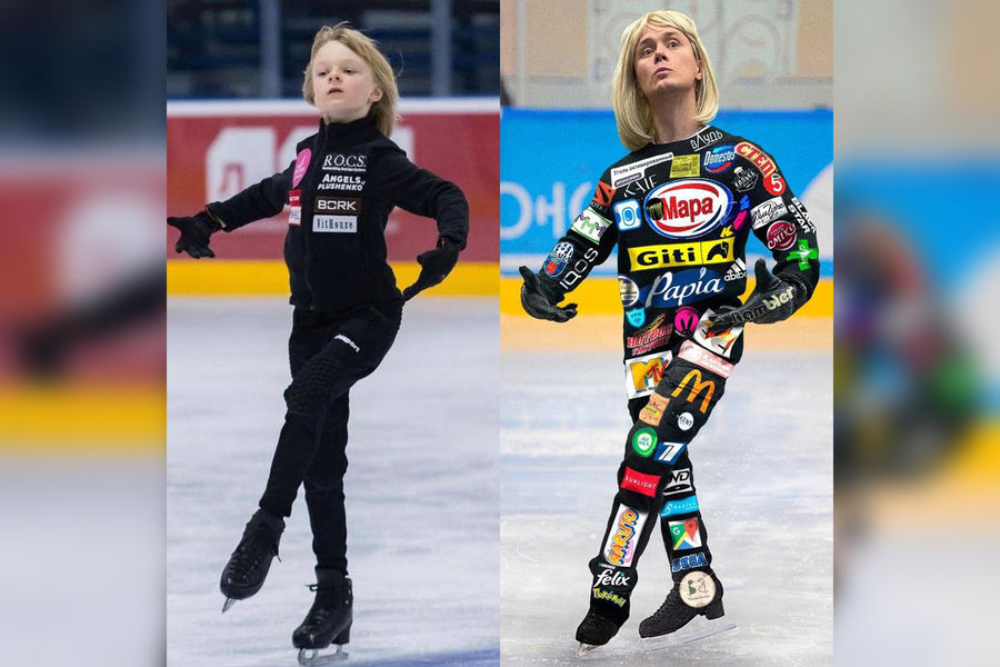 Артист также выложил фотографию, на которой с помощью фотошопа изобразил себя в образе фигуриста. На костюме Соболева, в свою очередь, видна реклама активированного угля, туалетной бумаги, компьютерной игры Dota 2, ресторана Моргенштерна, покемонов и многих других брендов.