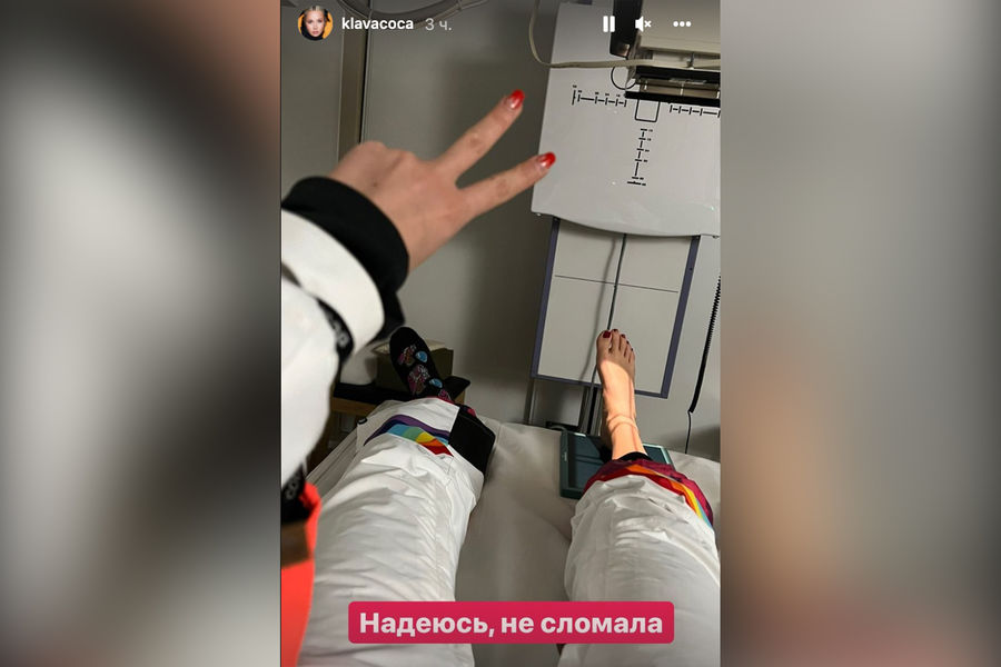 Девушка пережила падение, после которого опасалась, что сломала ногу. Артистке понадобилась кратковременная госпитализация. За рентген ей пришлось заплатить сумму в 35 тыс. руб. «Кости целы! А вот связки...» — написала по итогам снимка получившая серьезное растяжение певица. Из-за ушибов Клаве Коке приходится передвигаться на костылях.