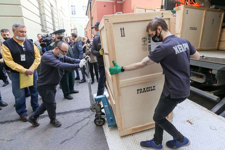 Отмечается, что сотрудники музея сняли пломбы с кузова грузовика в присутствии представителя Федеральной таможенной службы, после чего приступили к разгрузке ящиков с произведениями искусства.