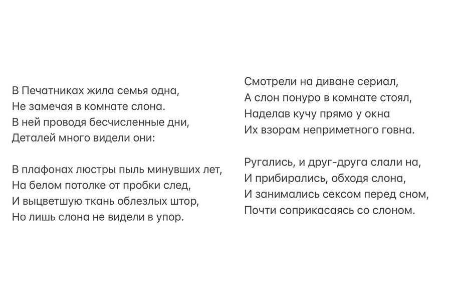 В личном блоге артист опубликовал стихотворение про слона. «В Печатниках жила семья одна, не замечая в комнате слона. В ней проводя бесчисленные дни, деталей много видели они: в плафонах люстры пыль минувших лет, на белом потолке от пробки след, и выцветшую ткань облезлых штор, но лишь слона не видели в упор», — написал Слепаков.