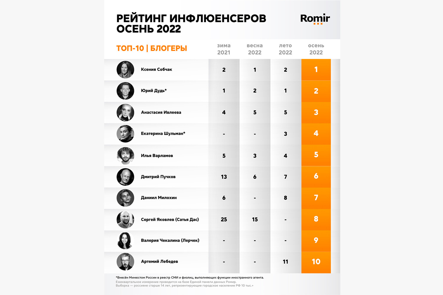 Лерчек также оказалась в рейтинге — блогерша впервые попала в список самых влиятельных инфлюенсеров в России. Ида Галич и Дима Масленников выбыли из рейтинга.
