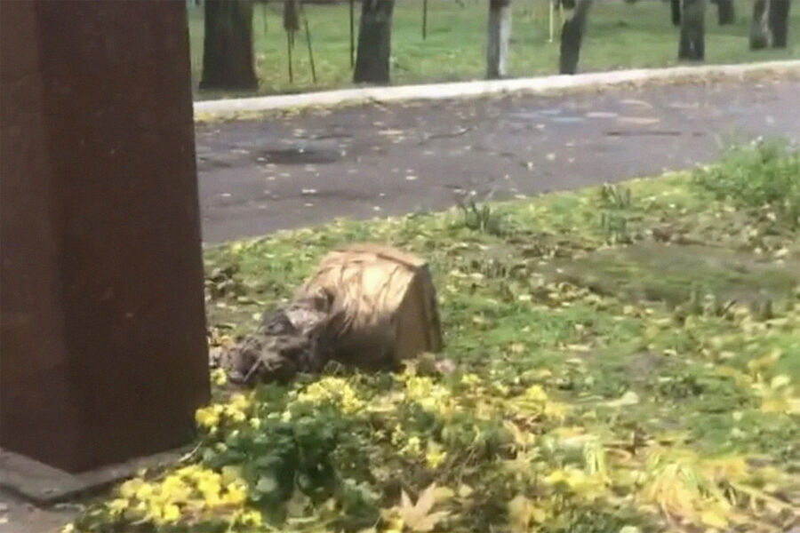 Причины падения монумента в сюжете телеканала уточнять не стали. До этого памятник подвергался нападению неизвестных вандалов, разрисовавших его буквами Z.