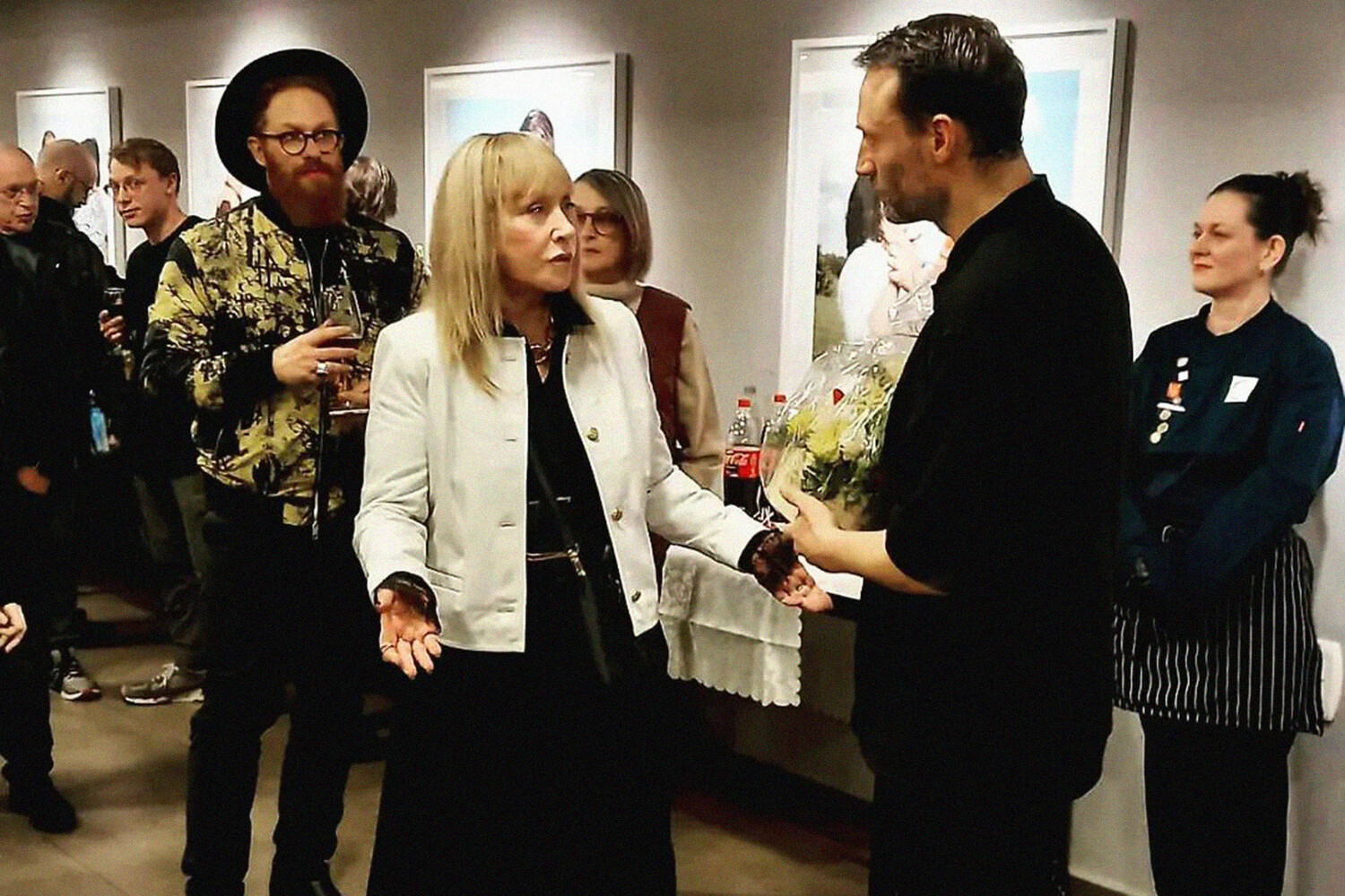 После моноспектакля «Я здесь» Примадонна лично пообщалась с актером, этот момент попал на камеру. Для выхода исполнительница выбрала черное платье в пол, поверх которого накинула белый жакет.