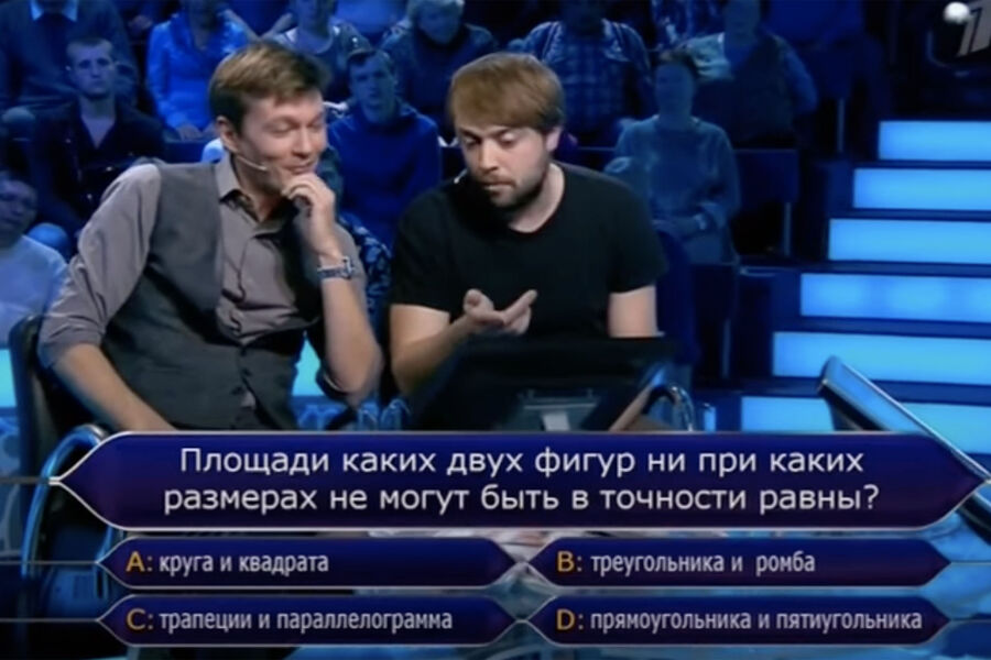 Пользователи Twitter поспорили о корректности математического вопроса из шоу «Кто хочет стать миллионером?» — площади каких фигур ни при каких размерах не могут быть в точности равны? Мнения разделились — одни считают, что можно построить фигуру любой площади, другие ссылались на нерешенную задачу о квадратуре круга: нельзя построить квадрат, равный по площади кругу с помощью циркуля и линейки.