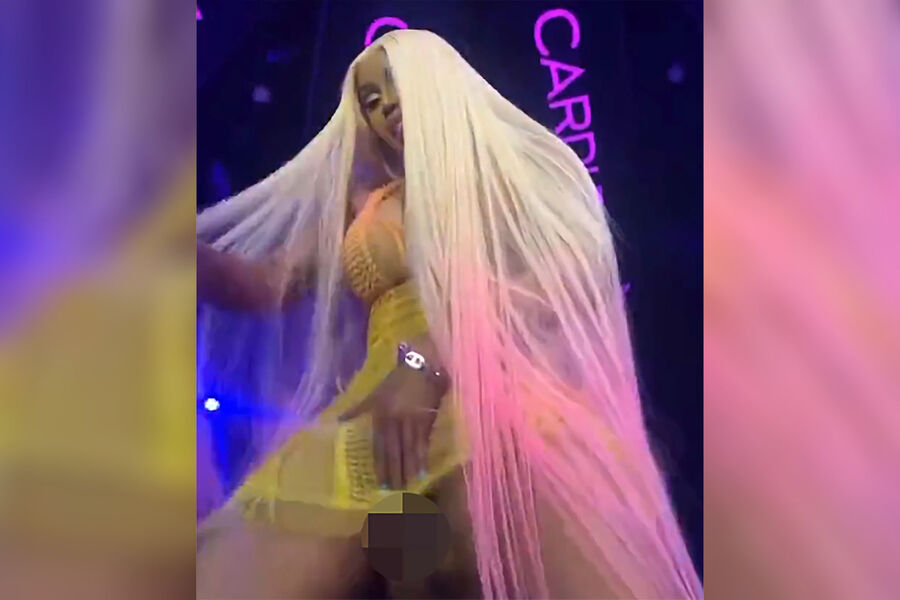 На сцену 30-летняя исполнительница вышла в коротком желтом платье, и близко стоящие зрители смогли увидеть не только отсутствие белья, но и веревочку от гигиенического тампона, заметно свисающую между бедер Карди Би. Рэперша совершала тверкающие движения и поглаживала свои интимные органы.
