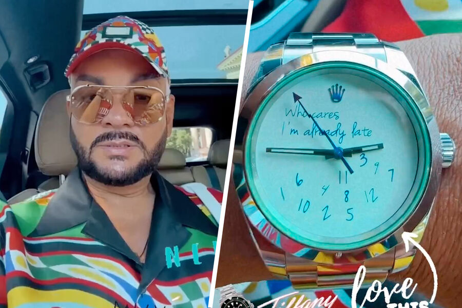 Украшение является кастомизированной версией часов Rolex Milgauss с надписью «Who cares I'm already late» («Какая разница, я уже опоздал» — перевод с английского).