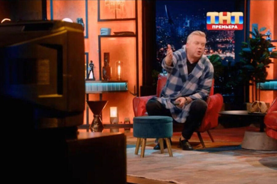 В рамках шоу Светлаков надел типичный для героя халат, сел перед телевизором и начал обозревать шоу, в котором принимает участие.