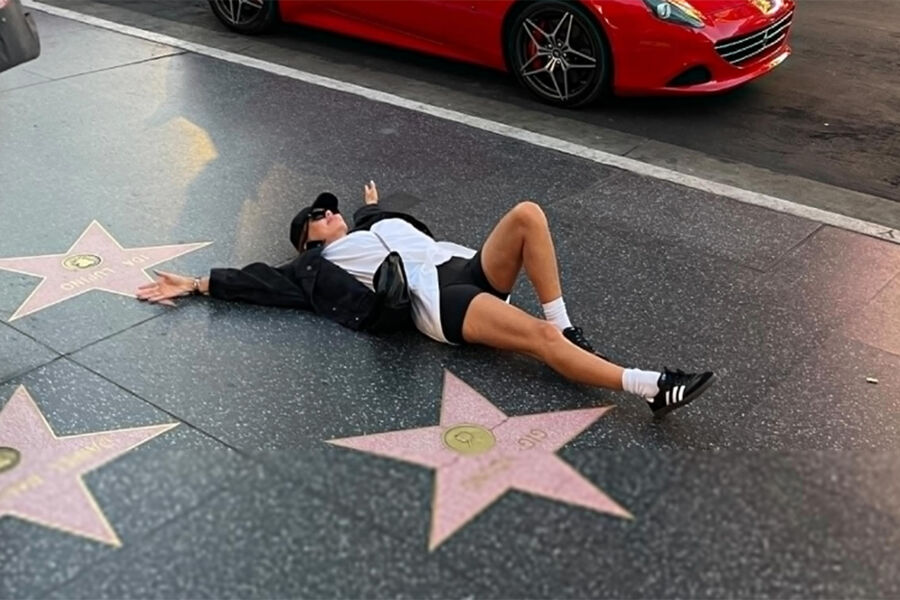 Блогер и модель Виктория Боня показала в Instagram (владелец компания Meta признана в России экстремистской и запрещена) свою медитацию на Аллее славы в лежачем положении.