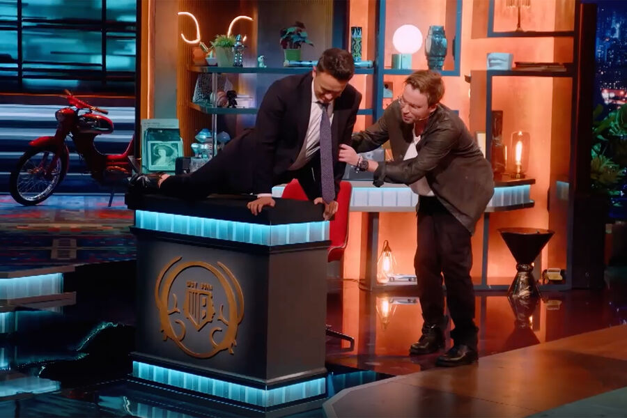 Ведущий шоу Павел Воля попросил рассказать в подробностях, как работают над подобными сценами. Его соведущий Илья Соболев предположил, что артисты должны встать в определенную позу. Для наглядности он лег на стол.