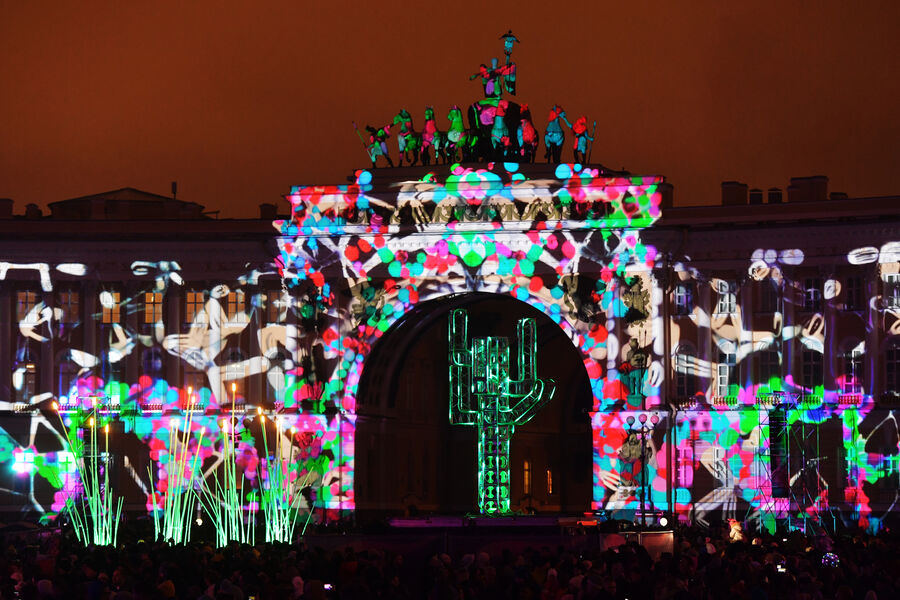 Каждая из световых инсталляций фестиваля рассказывает об определенном периоде истории, о современности и будущих проектах. Здесь есть ведущий вдаль двор-колодец, стена из таращащихся глаз и огромный фрегат, а также петропавловские зайцы.