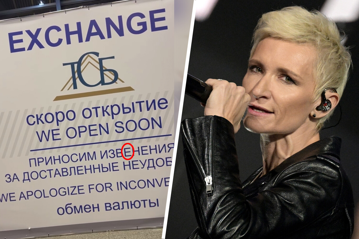 Арбенина показала баннер в аэропорту, на котором одна из компаний «приносит извенения» за задержку открытия пункта обмена валюты. Артистка назвала эту ошибку «позорищем».