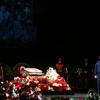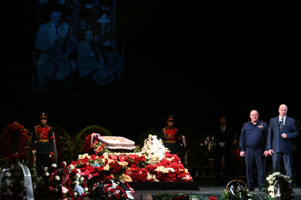 На сцене установлен гроб, в зале играет негромкая музыка, на экране показывают фотографии актера.