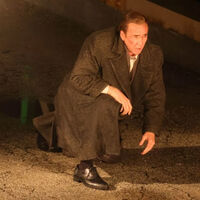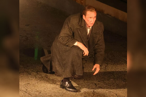 На серии фото актер одет в черное пальто и классический костюм, у него видны ссадины на лице. Судя по кадрам, Кейджа засняли, когда снимали сцену, как его герой приходит в себя после столкновения — на одном из фото актер лежит на земле, а на последующих он тяжело встает.