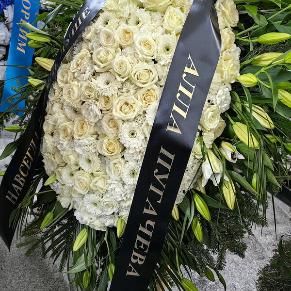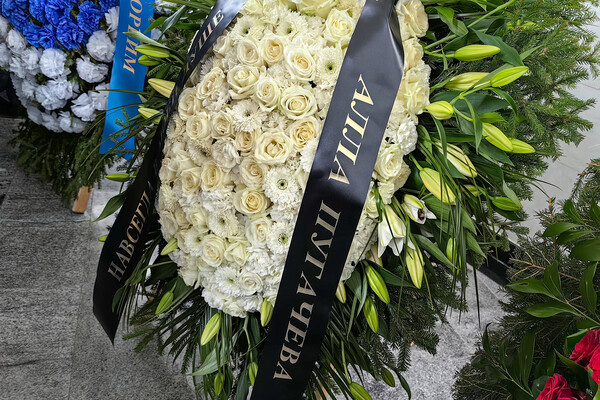 Первый венок, который доставили на церемонию, был послан Аллой Пугачевой, отмечает Telegram-канал.
