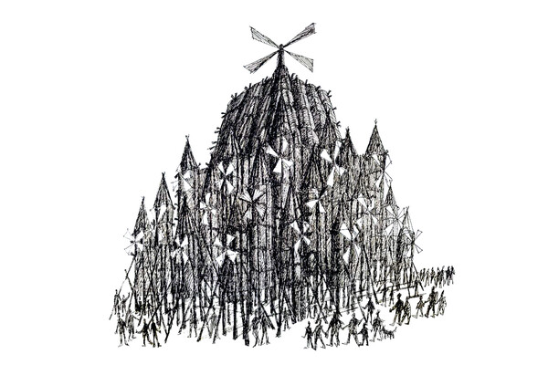 Полисский создал «Мельницы» — комплексное сооружение из 24 башен, центральная из которых достигает высоты 26 метров. В качестве материала использовали отработанное дерево — горбыль, паллеты, тонкомер — и сено.