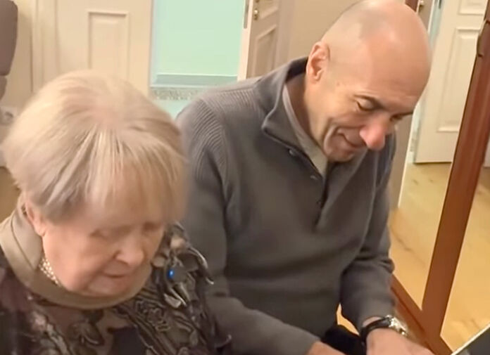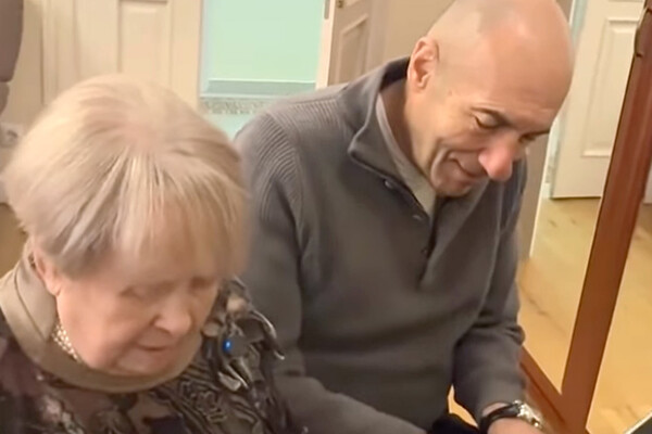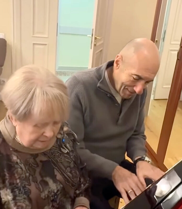 На видео показано, как Крутой фотографируется с 95-летней Александрой Пахмутовой, а также играет с ней на музыкальном инструменте в четыре руки.
