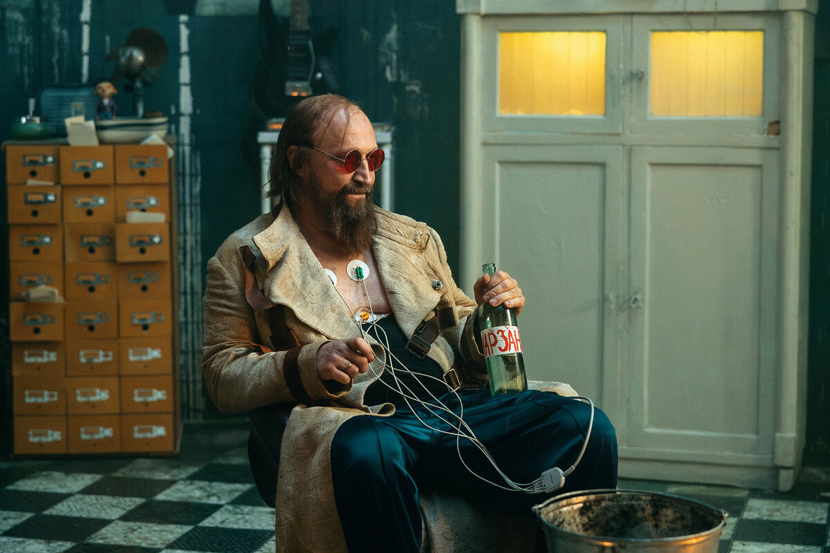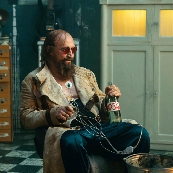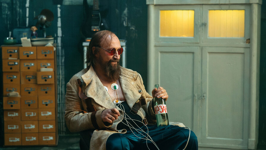 Для роли харизматичного злодея Куценко примерил красные очки и халат. На новых кадрах со съемочной площадки фильма он позирует с датчиками ЭКГ на груди и с бутылкой «Нарзана» в руке.