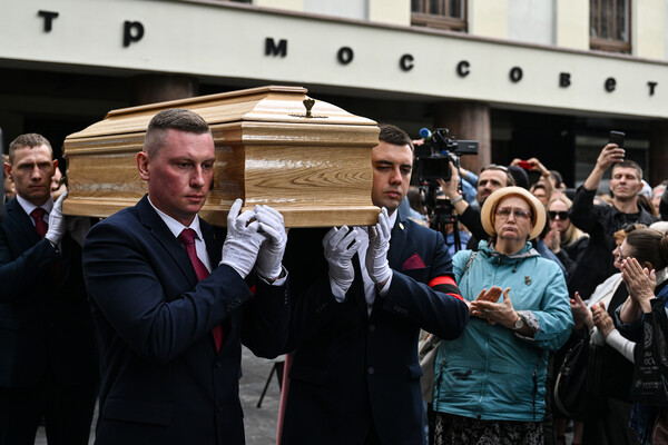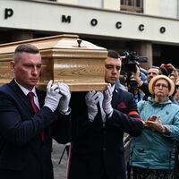 Церемония прощания с народной артисткой РСФСР, проходившая в театре, закончилась. В начале колонны вынесли портрет Валентины Талызиной и ее медали. Затем вышла ее дочь Ксения Хаирова — ее выводили из здания под руки.