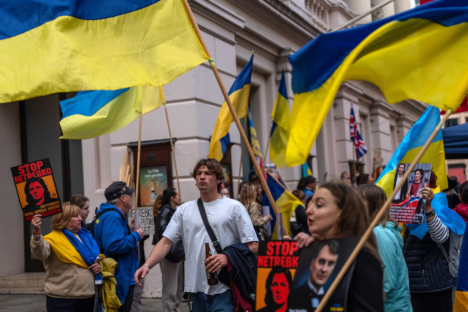 Как сообщает The Guardian в репортаже, в один из дней на демонстрацию пришли десятки людей — около 50 человек. Они развернули плакаты с фразами о том, что Нетребко поддерживает российскую власть, и украинскими флагами. Активисты призывали отменить выступление российской артистки.