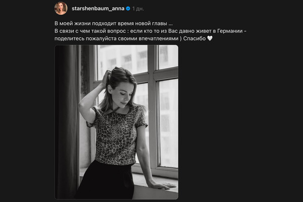 Актриса опубликовала в личном блоге публикацию с фразой: «В моей жизни подходит время новой главы…» Она попросила подписчиков, которые давно живут в Германии, поделиться своими впечатлениями о жизни в этой стране. При этом звезда не стала подтверждать, что намерена уехать из России.