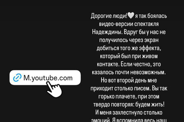 Отдельно Машкова выразила благодарность зрителям, которые посмотрели спектакль из России и Украины. Она пообещала вернуться в эти страны с живым выступлением.