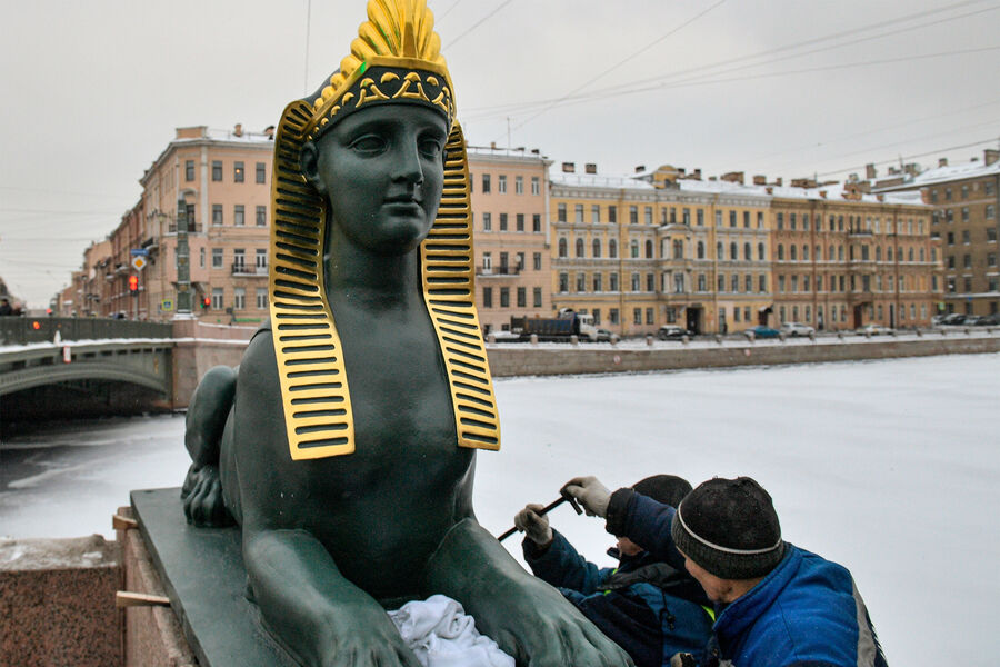 Сфинксов, украшающих Египетский мост через Фонтанку в Санкт-Петербурге, сняли с постаментов и направили на реставрацию. Об этом ообщается в Telegram-канале Государственного музея городской скульптуры (ГМГС).