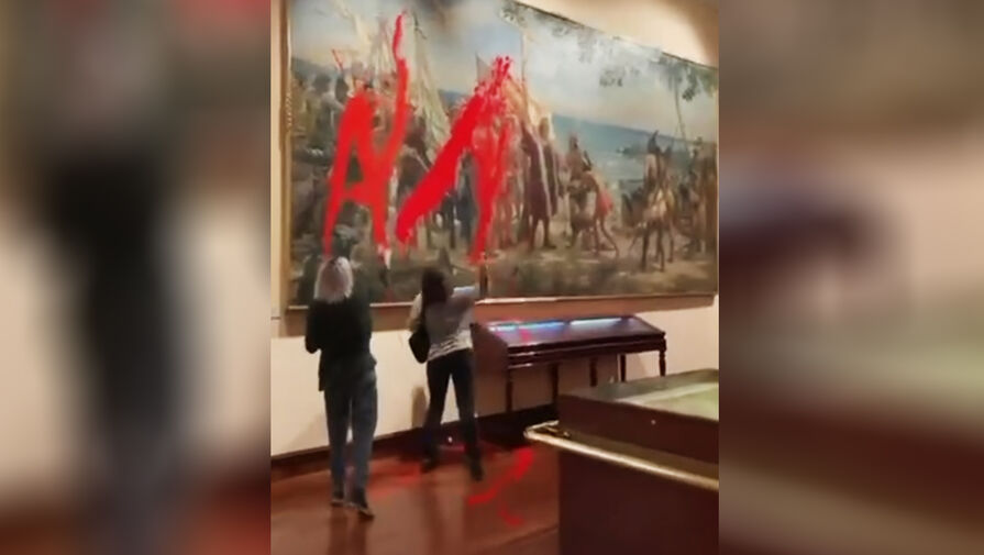 В музее Мадрида облили краской картину «Первое чествование Христофора Колумба». Об этом сообщили в соцсети X активисты экологической организации Futuro Vegetal.