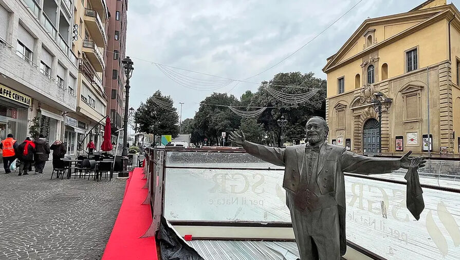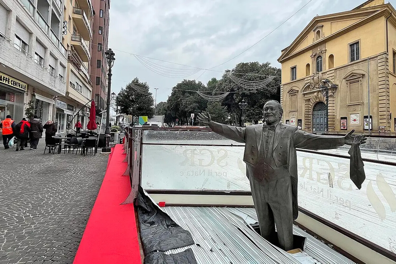 Статуя, изображающая маэстро в концертном костюме с распростертыми объятиями, оказалась посреди будущего рождественского катка — сейчас она по колено утопает в деревянных конструкциях , установленном на центральной площади города.