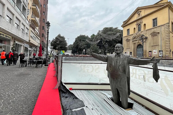 Статуя, изображающая маэстро в концертном костюме с распростертыми объятиями, оказалась посреди будущего рождественского катка — сейчас она по колено утопает в деревянных конструкциях, установленных на центральной площади города.