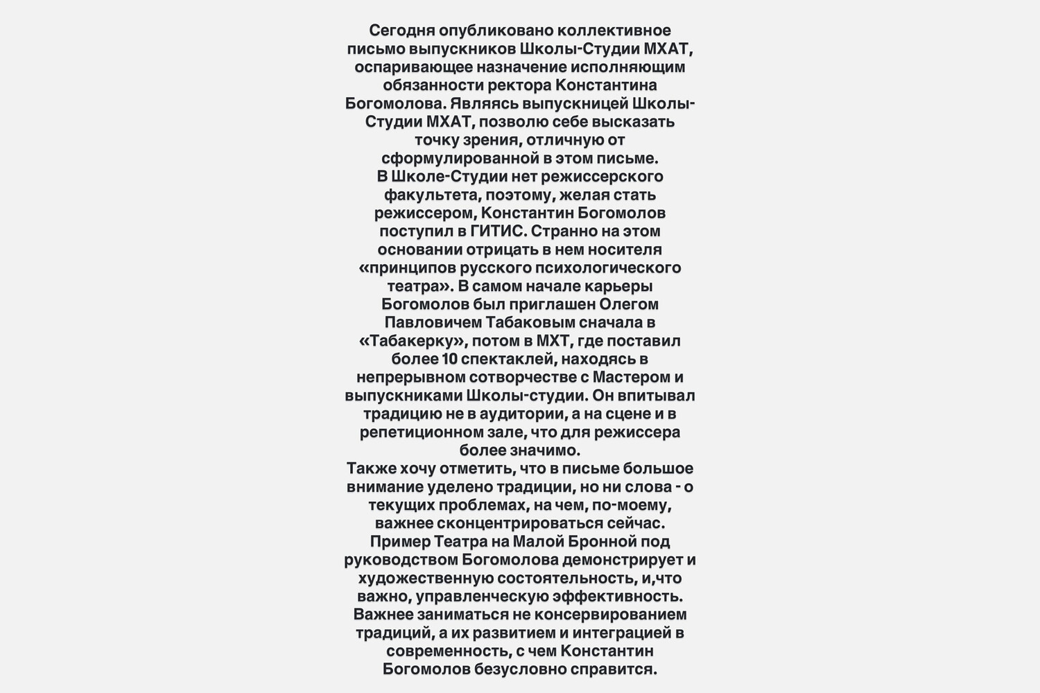 «Важно не консервировать традиции, а развивать их и адаптировать к современности, с чем Богомолов справится», — добавила она.