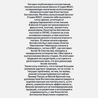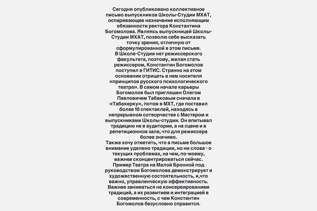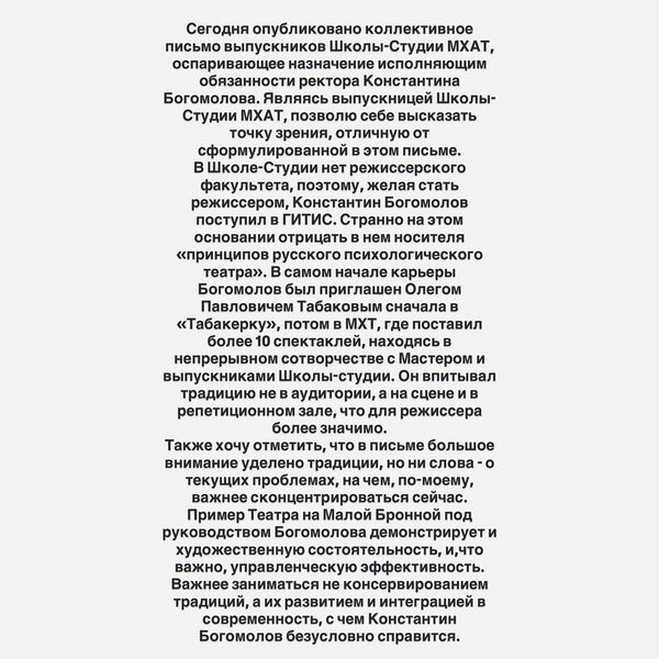 Актриса и выпускница МХАТа Софья Эрнст выступила в поддержку Константина Богомолова на посту врио ректора Школы‑студии. Свое обращение она опубликовала в Instagram (владелец компания Meta признана в России экстремистской и запрещена).