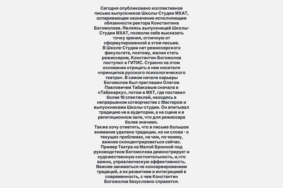 Эрнст возразила, что отсутствие у Богомолова диплома режиссерского факультета МХАТ не должно быть препятствием.