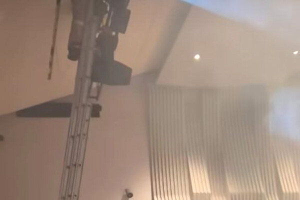 Концерт был остановлен, на место происшествия вызвали пожарных-спасателей. Они с помощью стремянки поднялись наверх и сняли оставшуюся часть конструкции.