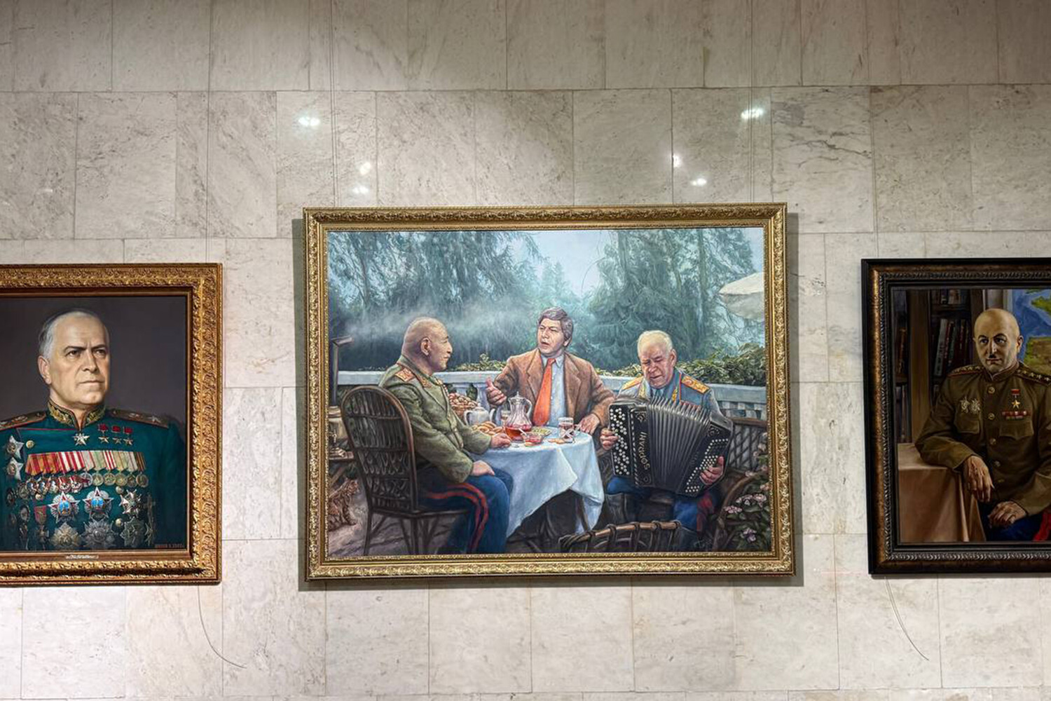 В экспозиции также представлена картина Федора Селезнева под названием «Чаепитие в Сосновке. Май 1972 года». На ней изображена дружеская встреча маршалов Победы Георгия Жукова и Ивана Баграмяна с певцом Бедросом Киркоровым.