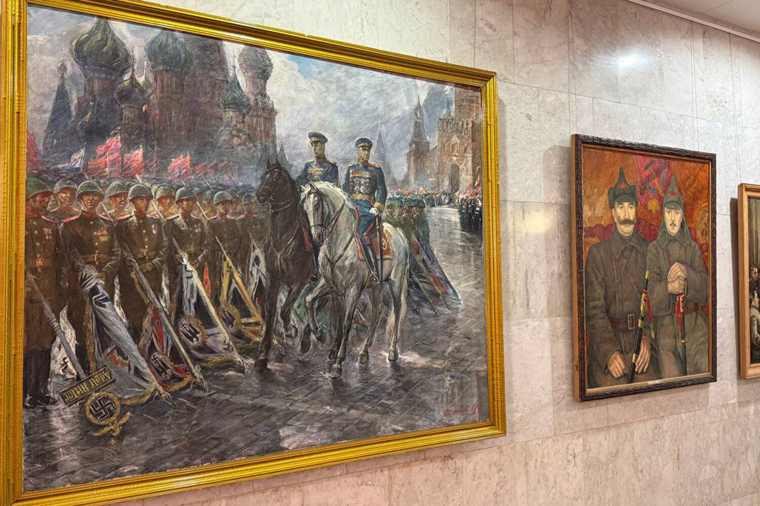 На выставке центральное место заняла масштабная картина «Наша Победа!», автор которой — Олег Маслов — создал собирательный образ поколения героев войны. На полотне изображены не только военачальники во главе с Иосифом Сталиным, но и солдаты различных родов войск, ополченцы, рабочие, конструкторы, женщины, дети и старики.