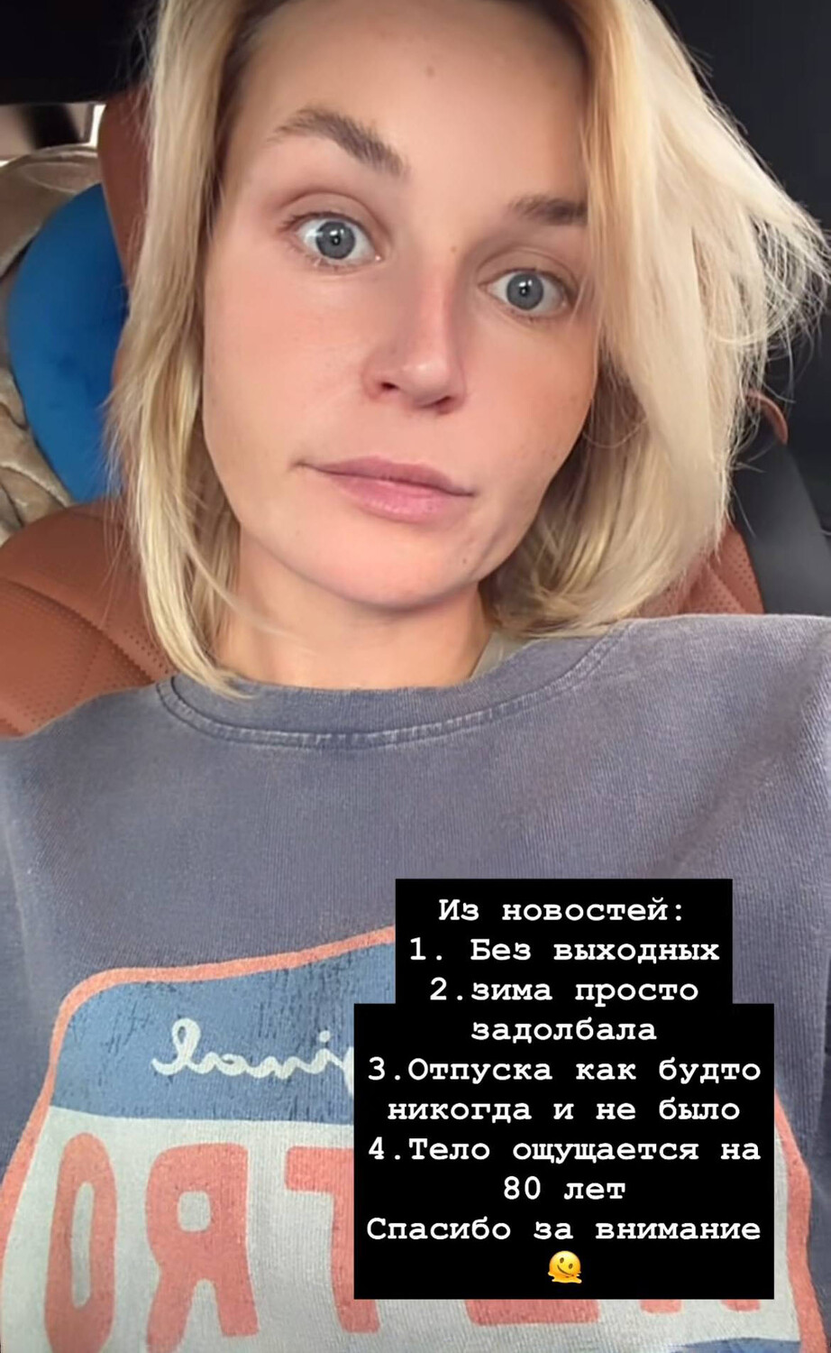 «Из новостей: без выходных; зима задолбала; отпуска будто никогда и не было», — написала исполнительница.