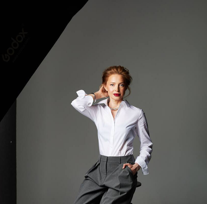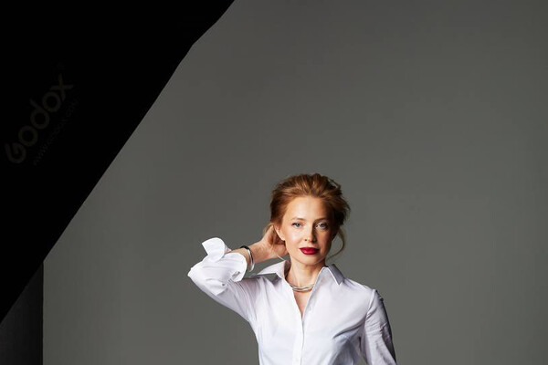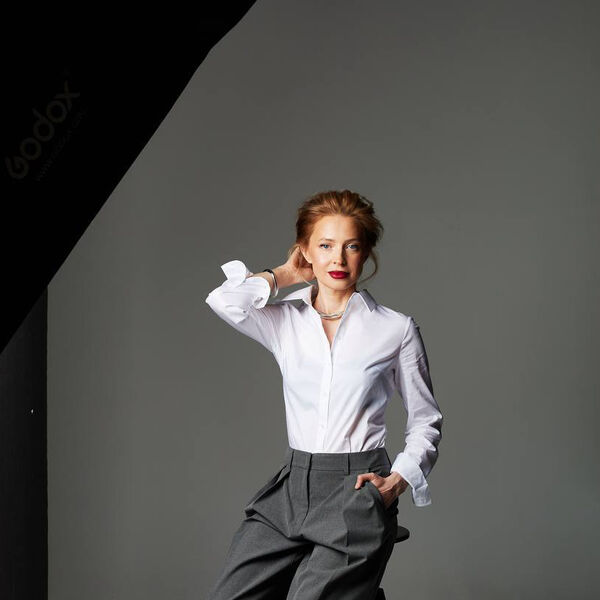 Поклонская предстала на фотосессии в белой блузке и серых брюках