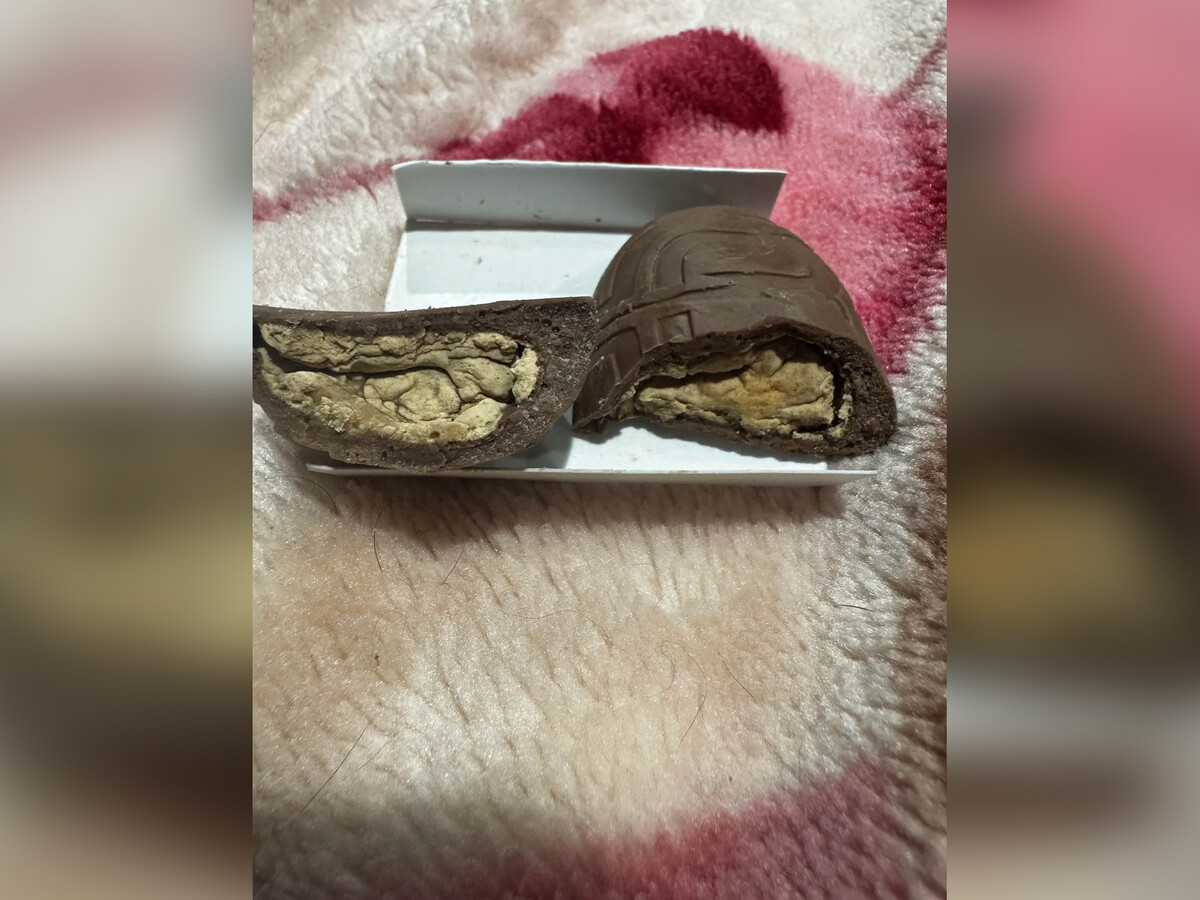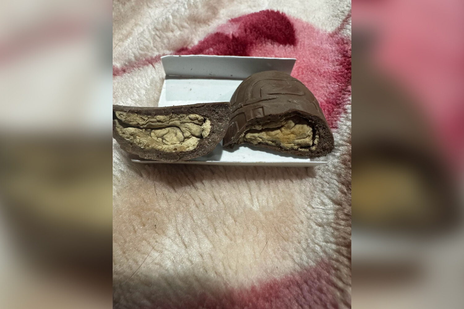 В разломе шоколадной конфеты на фотографиях можно различить испорченную начинку вместо заявленного арахисового масла.