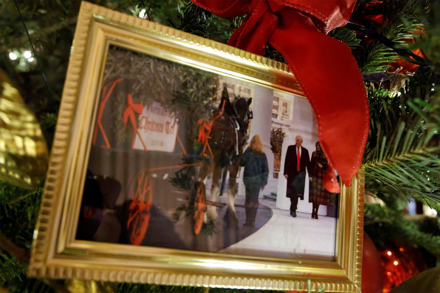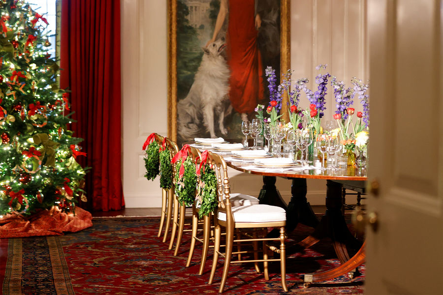В парадной столовой поставили две большие ели, украшенные фотографиями бывших президентов США вместе с их женами, а также несколькими изображениями из частного архива Байдена, которые никогда раньше не публиковались. На одной из праздничных елок даже нашлось место небольшой фотографии Дональда Трампа с женой Меланией. В коридоре Белого дома также повесили рождественскую открытку от Трампа наряду с поздравлениями других политиков.