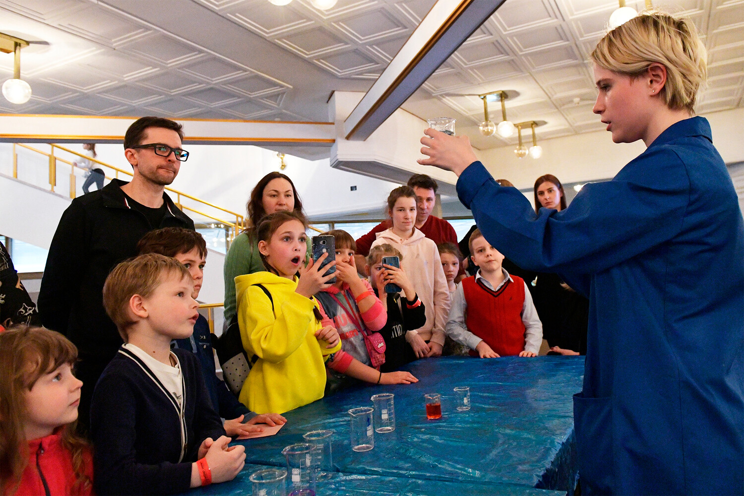 Дети участвуют в научном эксперименте с водой в рамках весеннего фестиваля науки «WOW? HOW!» в Большом концертном зале Российской академии наук в Москве