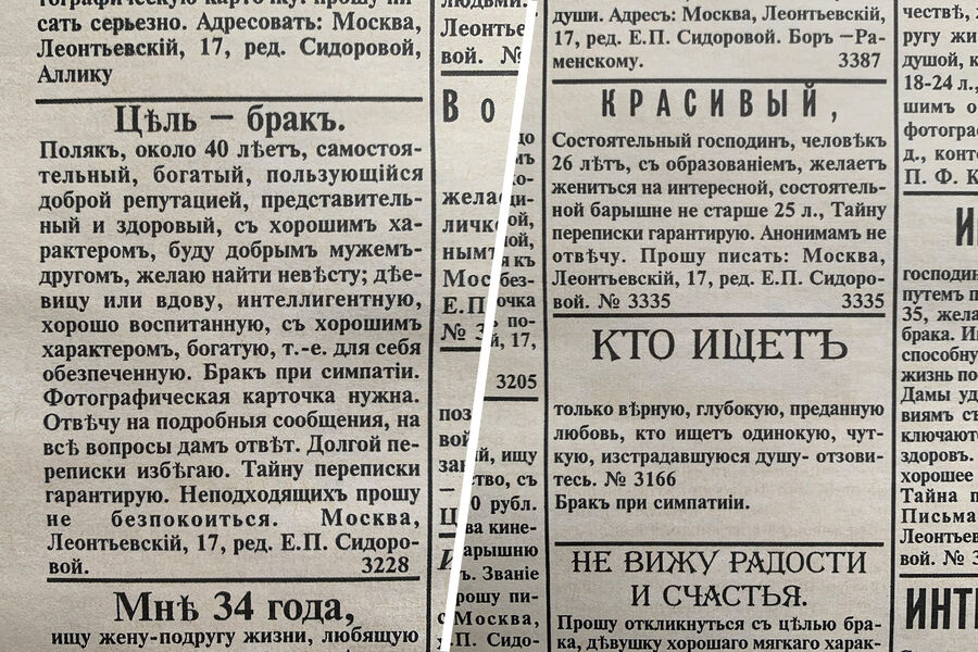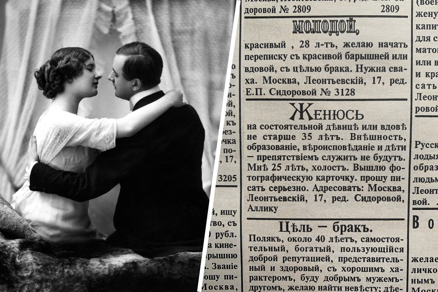 Одним из способов найти партнера в начале XX века было дать объявление в специальную газету. Большой популярностью пользовалась «Брачная газета», выходившая с 1906-го по 1917 годы. Каждое воскресенье однополосная газета разлеталась во все уголки Российской империи. В ней размещали объявления самые разные мужчины и женщины в поисках симпатии. По желанию подписчиков издание присылали в наглухо запечатанном конверте без штемпелей и внешних знаков. Переписка велась через редакцию газеты, ее участникам гарантировали полную конфиденциальность.