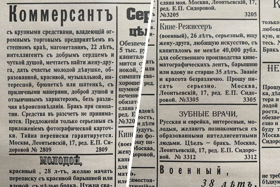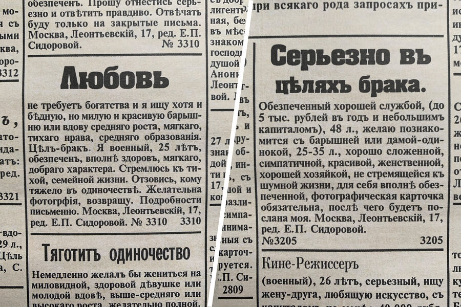 «В публикациях начала XX века большинство подписчиков ищет партнеров по браку, заинтересованы в длительных отношениях. Общая тональность объявлений носит аккуратный и даже трепетный характер. Никакого намека на фривольность. При этом довольно четко и прозрачно анонсируются экономические ожидания от брака», — комментирует объявления системный семейный психотерапевт, семейный психолог онлайн-школы «Психодемия» Ася Кочергина.