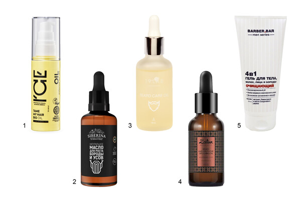 1. Масло для тусклых и вьющихся волос ICE Professional, NS TAME MY HAIR OIL 2. Масло для бороды и усов, Siberina 3. Масло для бороды Beard Oil, 19Lab Cosmetics 4. Масло для бороды и усов питательное, 30 мл, Zeitun 5. 4 в 1 гель для тела, волос, лица и бороды, Barber.Bar