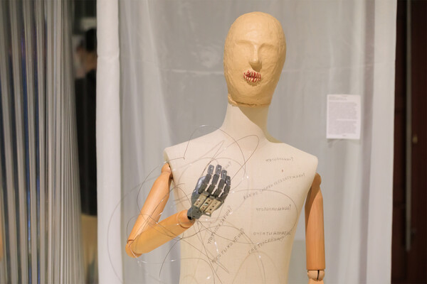 Я решил визуализировать состояние дереализации с помощью манекена K12. Руки манекена я заменил на протезы, чтобы показать ощущение несовместимости с телом. Также я облепил его глиной и скульптурным пластилином — чтобы подчеркнуть человеческие черты лица и тела и контраст между манекеном и роботом. Кроме того, рот манекена зашит нитками — они лишают возможности говорить, оставляя ему шанс лишь наблюдать за происходящим вокруг».