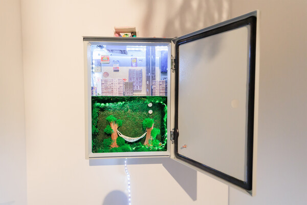 «Для меня направление «Место, где я» соединяет в себе две среды — городскую и природную. В своей работе я объединяю эти две среды и пытаюсь проследить необходимость в нашей жизни как инновационных «помощников», так и обыкновенного дерева. Моя инсталляция — это интерактивные макеты города и природы, с которыми зритель может взаимодействовать при помощи света, переключателей и маркеров. Найдя ключ и заглянув внутрь электрического щитка, в котором я разместила инсталляцию, зритель может узнать себя, когда ему после тяжелого рабочего дня хочется пройтись в парке и насладиться тишиной или шелестом деревьев. А может, ему отзовется и шумная городская среда, по которой он так скучал».