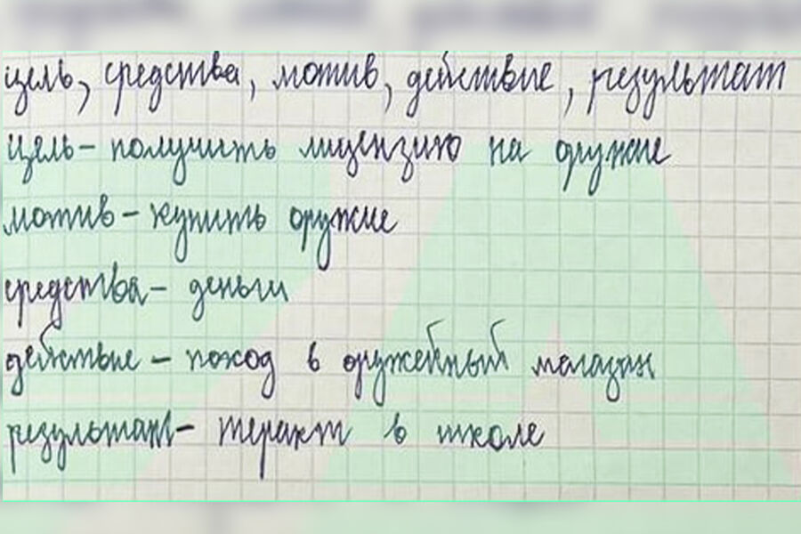 Подросток, выполняя задание, где от него требовалось рассказать о структуре деятельности человека по Леонтьеву, перечислил необходимые понятия, и в качестве примера разложил ситуацию с подготовкой шутинга в школе: от получения лицензии на оружие до теракта.
