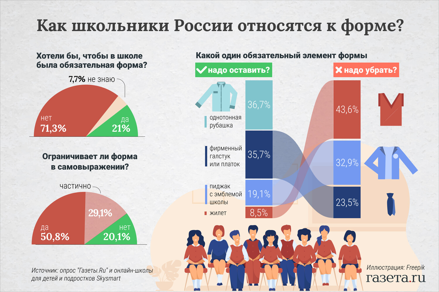 Более 70% российских школьников против введения обязательной школьной формы. Только 21% учащихся считают, что форма в школах нужна, а 7,7% затруднились ответить. Это следует из результатов исследования «Газеты.Ru» и онлайн-школы для детей и подростков Skysmart, проведенного в декабре 2022 года.