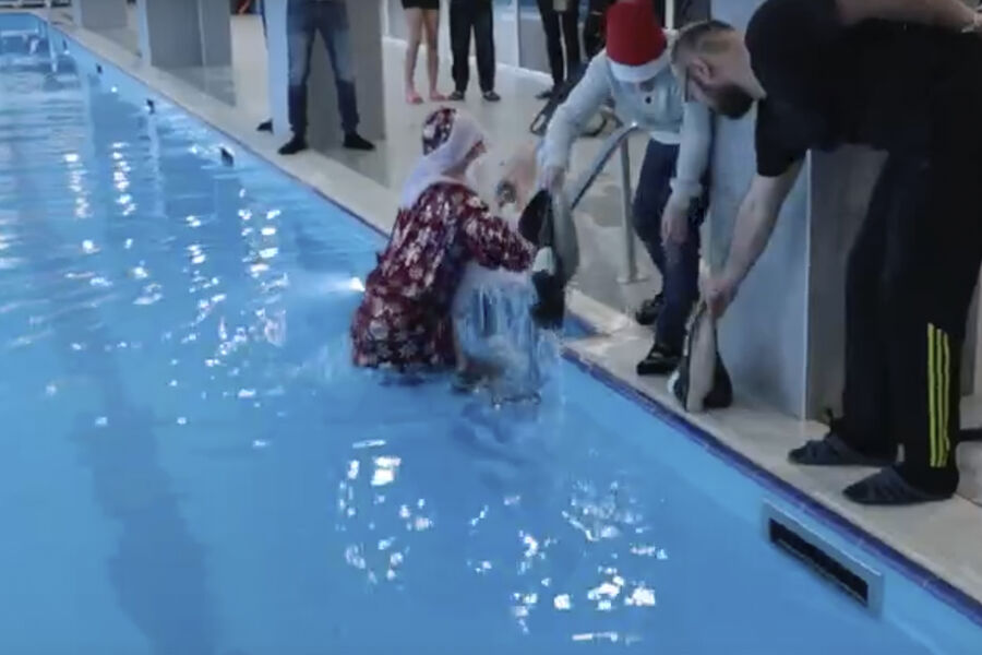 На опубликованном видео видно, как Дед Мороз поднимается из бассейна и проходит мимо аплодирующих очевидцев. Также на снимках можно заметить, что с переодетого в зимнего волшебника мужчины во время падения упали валенки, которые позже местные жители достали из воды.